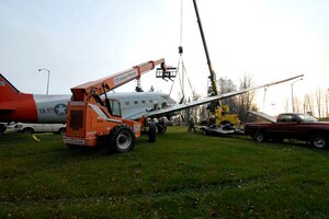 Contractors here disassemble a C-47 Oct. 26, 2010, in order to transfer the static display aircraft to Joint Base Elmendorf-Richardson (JBER). This transer begans the 176th Wing's physical move to JBER, mandated by the 2005 Defense Base Realignment and Closure Act.As of Dec. 6, 2010, five of Kulis'