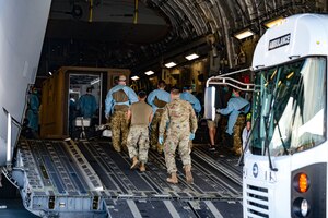 A critical air transport team from the 18th Aeromedical Evacuation Squadron and 15th Medical Group personnel escort a patient into a Negative Pressure Conex-Lite during an aircraft swap at Joint Base Pearl Harbor-Hickam, Hawaii, Sept. 21, 2022. This was the first instance within the U.S. Pacific Air
